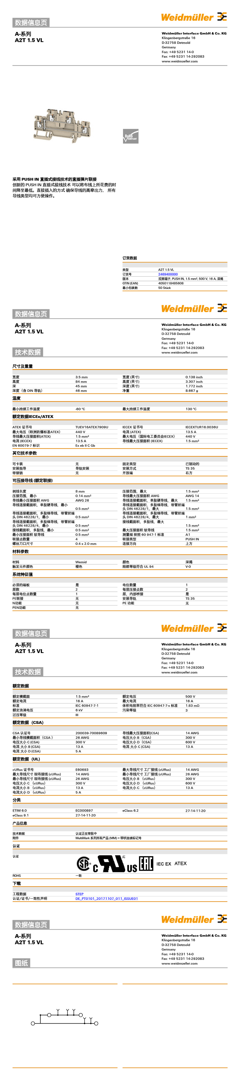 Weidmuller/魏德米勒 A直插式直通型接线端子